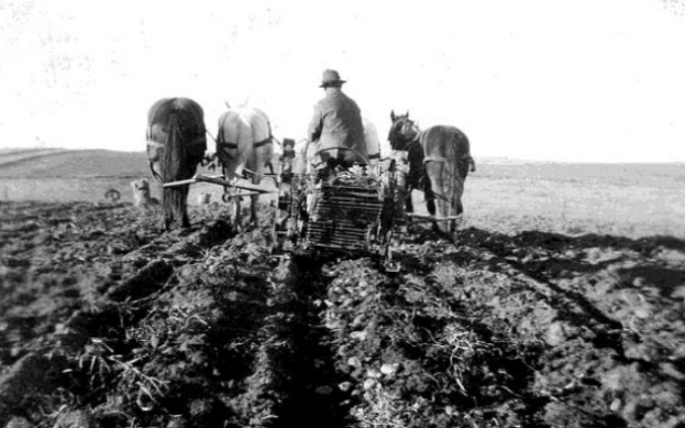 They touted The Divide’s dryland farming over that of irrigation ‘under a ditch,’ and gloriously reported high average yields (potatoes: 5,195 pounds per acre, wheat 19 bushels, oats 34 bushels, barley 25 bushels, rye 15 bushels, turnips and rutabagas 11,350 pounds, millet and rye hay 1-3/4 tons. And “it is safe to say that potato culture on the Divide pays a greater net profit to the acre than in any other country east or west.” In 1877, one farm alone raised 25,000 pounds of potatoes. It was not unusual for Dryland Potato Farming one potato to weigh 3-1/4 pounds. Potatoes were compatible with dryland farming and grew well in the unique climate and rich soil of The Divide. They became its leading cash crop and gained an excellent reputation. To celebrate the harvest, a potato bake was held each fall in Monument with thousands coming by train and wagon from near and far for the grand gathering. Eastonville claimed that it was the “Potato Capital of the World.” The title of Divide Potato King was bestowed on the best grower each year. Blight eventually destroyed the potato crops – first hitting the western edge of The Divide around 1895 and working its way east to Table Rock and Eastonville by the mid-1930’s.